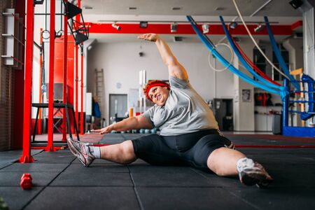 Fat woman exercises on the floor, workout in gym
