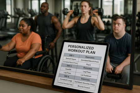 Group of individuals, including a person in a wheelchair, follows a personalized workout plan in a modern gym setting, focusing on strength and fitness