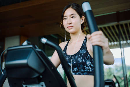 Girl look at camera while do exercise on orbitrek