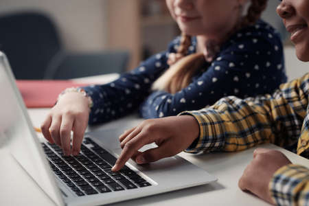 Close-up of two kids typing together on laptop during online studying sitting at table