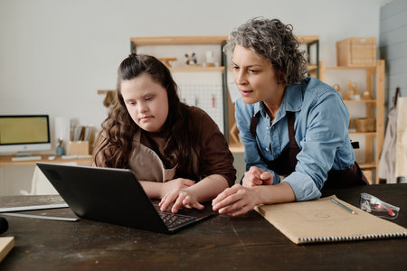 Carpenter using laptop with her student and discussing online project together with girl during work in workshop