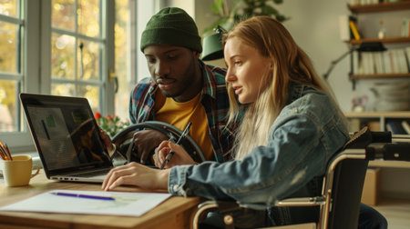Young Caucasian man sitting beside young Black woman discussing project, while pointing at laptop screen in modern business office with exposed brick walls and large windows