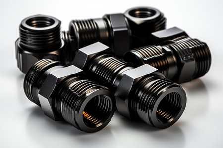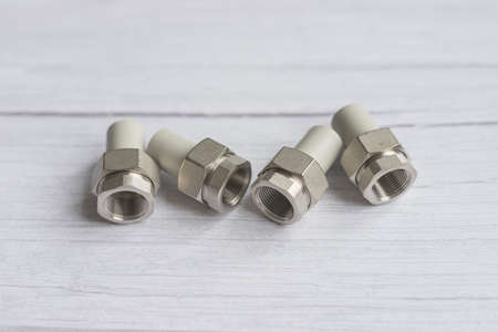 Combined couplings for connecting metal and polypropylene water pipes on desktop. Nuts in cold colors