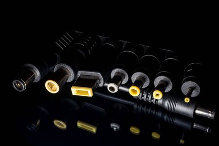 Close-up of different types of electronic connectors. Selective focus.