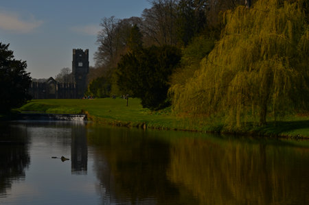An exterior view of the ruined Fountains Abbey church building in Yorkshire in England in the stunning tranquil park setting of Studley Royal.