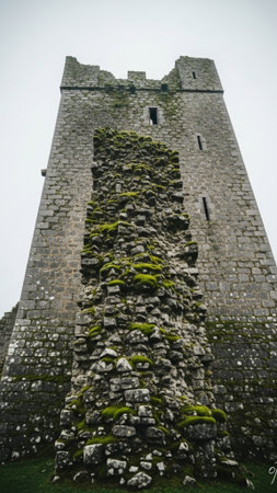 Vertical (9:16) cinematic photograph of a tall, imposing section of medieval Irish castle ruin wall.
