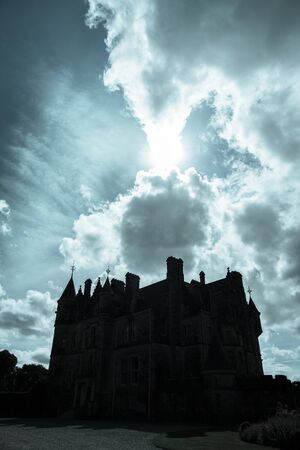 BLARNEY, IRELAND - AUGUST 12, 2017; Dark silhouette scary looking medieval castle back-lit by sun behind passing clouds, Blarney Castle and gardens
