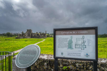Cashel, Ireland, August 2019 Information board with historical info about old ruins of Hore Abbey with dark dramatic storm sky in the background