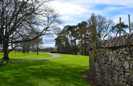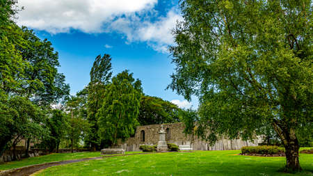 Garden of the Abbey Graveyard with green grass a path in the town of Athlone, wonderful sunny spring day in the county of Westmeath, Ireland