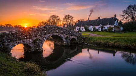 An old stone bridge arches over a calm river reflecting the vibrant colors of the setting sun. The landscape features a quaint cottage with a smoking chimney, framed by trees and a lush green lawn. The golden light illuminates the scene, creating a peaceful ambiance.