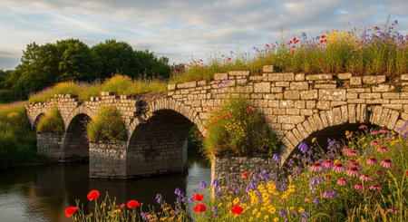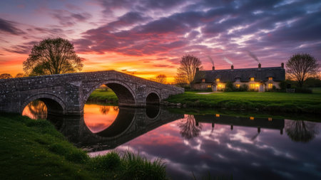 A stone bridge arches gracefully over calm water, reflecting the vibrant colors of a sunset. The scene captures a rural landscape with a building illuminated in the distance. The sky displays a beautiful array of colors, creating a peaceful atmosphere. The composition is well-balanced with good lighting.