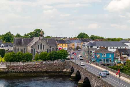 Galway, Ireland - August 5, 2017: Saint Vincents convent of Mercy behind Salmon Weir Bridge under blue sky with white clouds. Corrib River and green trees on its shore.