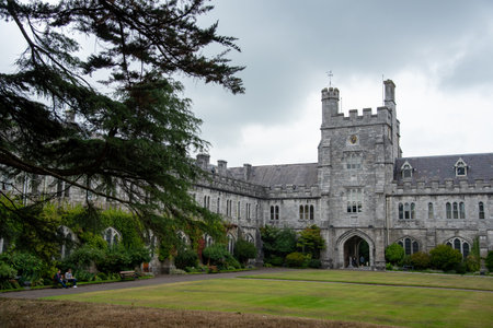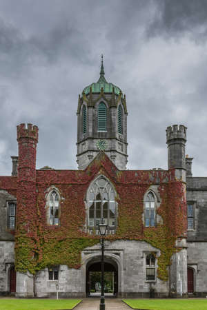 Galway, Ireland - August 5, 2017: Part of historic Quadrangle on National University of Ireland Campus. Closeup of entrance block covered in Ivy with clock tower under dark stormy cloudy sky.