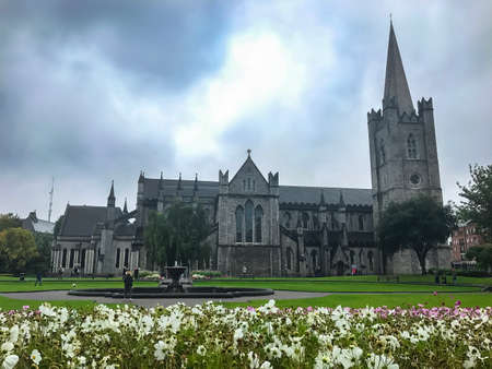St. Patrick Cathedral in Dublin Ireland with dark rainy sky and colorful flowers in the foreground