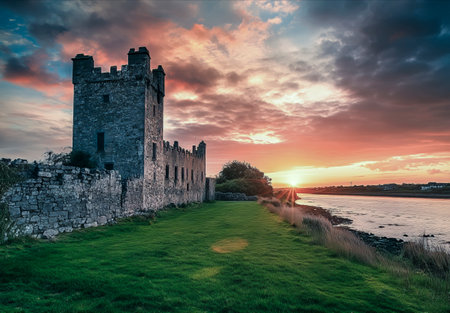 Ancient castle by the river illuminated by a vibrant sunset with dramatic skies and warm colors.