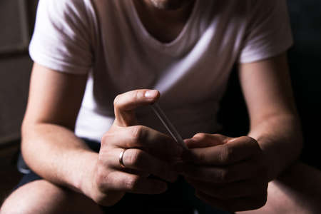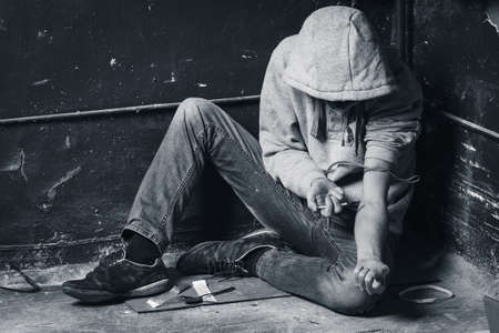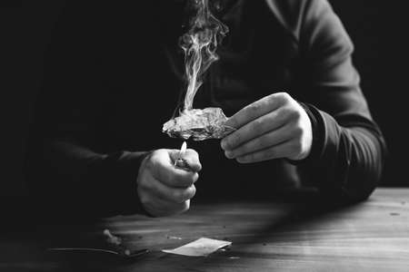 Addict/junkie man preparing drugs. The concept of crime and drug addiction.