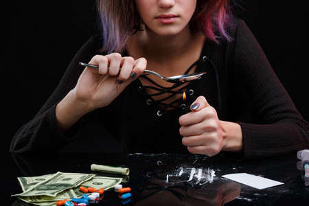 A drug addict girl warms up a drug in a spoon. Next to are tablets, dollar and cocaine. On a black background.