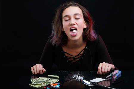 A drug-dependent girl swallows a narcotic pill. Next to the table are cocaine , dollar and syringes.