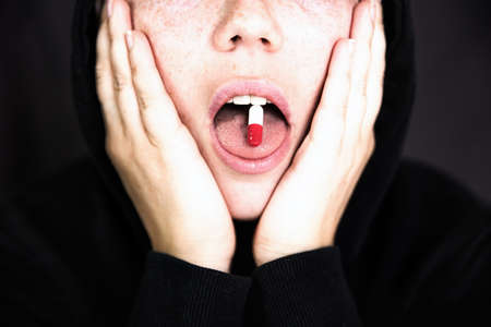 A woman is holding a pill, capsule with a drug on her tongue, teenager taking xtc.cocaine or other drugs or medicine