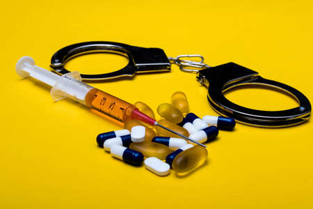Illegal drug crisis concept showing a full syringe, handcuffs and tablets on a yellow background