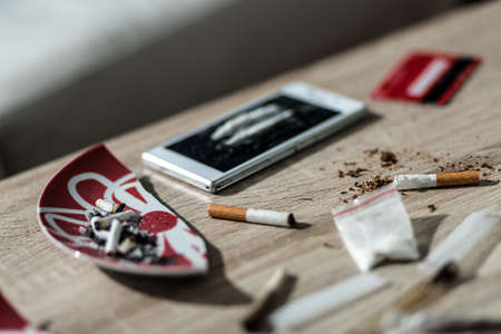 Close up on cigarette and lines of cocaine