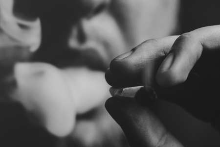 A man smokes cannabis weed, a joint and a lighter in his hands. Smoke on a black background. Concepts of medical marijuana use and legalization of the cannabis. On a black background