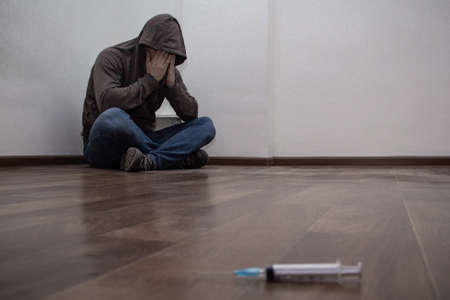 Syringe without of focus and man drug addict sitting in corner in the background. With copy space
