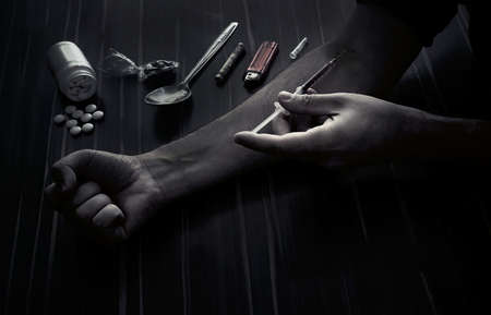 Man drugs addicted injecting heroine in his arm at the table with other drug on black background in the dark