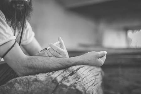 Addict man with a syringe in action. The concept of drug abuse and traffic.