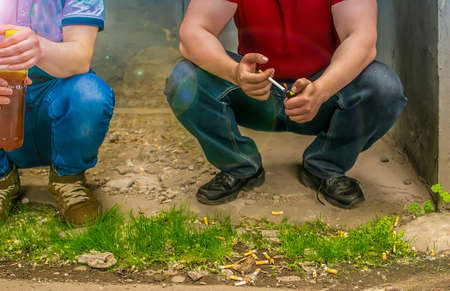 alcoholics, smokers and bad guys sit on the street near cigarette butts
