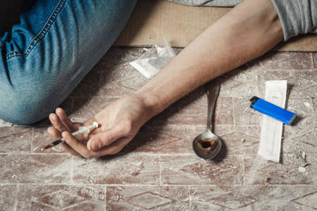 Hand addict and syringe with heroin lying on the floor. The concept of anti drugs. male drug addict hand, drugs narcotic syringe.