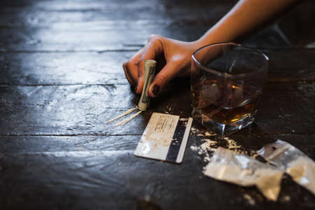 Cocaine and alcohol drink on dark background. Detrimental lifestyle. Bad habits. Alcohol and drug addiction. Important problem of modern society
