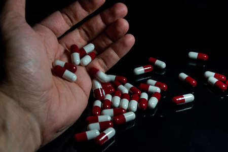 Pills in the dirty hands of a poor man on a black background. Hands of a person in need of treatment on a dark background