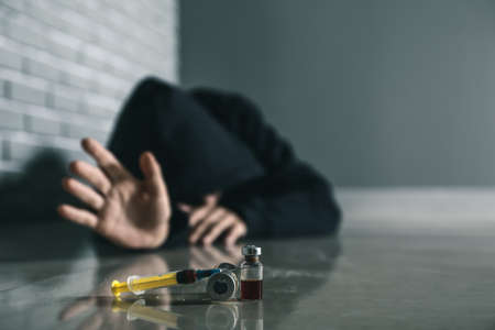 Drug addict man lying on the floor, overdose