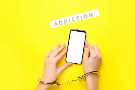 Woman with mobile phone and in handcuffs on color background. Concept of addiction to gadget