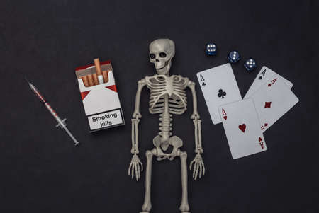 bad habits. Smoking, gambling and drug addiction. Pack of cigarettes, dice, four aces, syringe and a skeleton on black background.