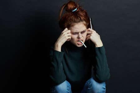 woman with bottle of alcohol smokes a cigarette depression bruises under eyes emotions
