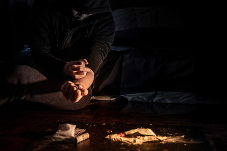 Young addicted man with cocain packet sitting alone