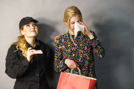Shoplifting is a crime. Teenage girl being caught on stealing clothes by female security guard. Customer thief