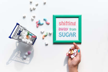 Frame with text Shifting away from sugar in hand. Excess of sweets, chocolate, candy, sweet food.