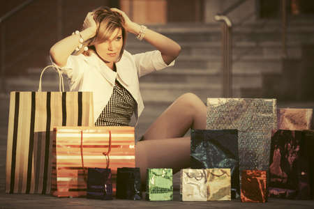Happy young woman sitting on city sidewalk Stylish fashion female model with shopping bags
