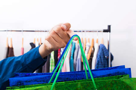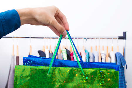 Shopping bag hanging in a clothing store outlet. Concept of consumerism
