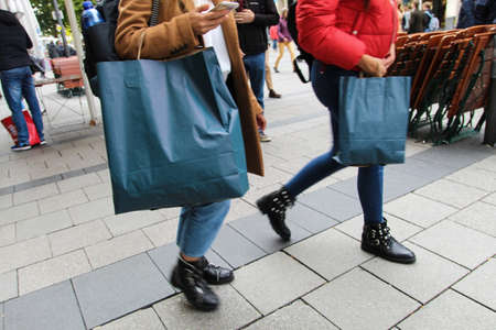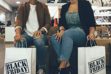 Black Friday. Cropped view of a couple of young female shoppers sitting in a shoe shop holding paper shopping bags.