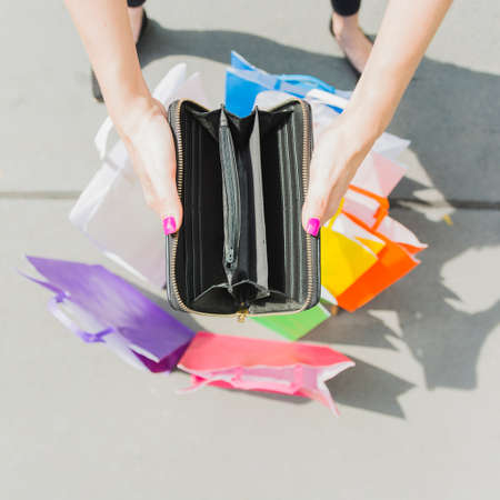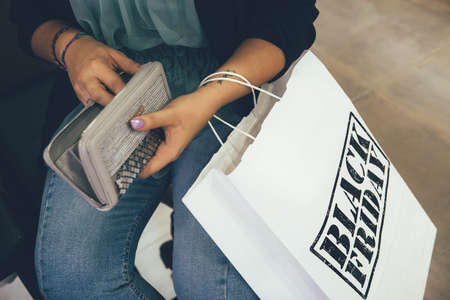 Black Friday. Close up of a cropped view of a female shopper takes money from the wallet to pay the purchase in a shoe shop.