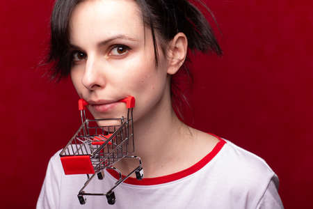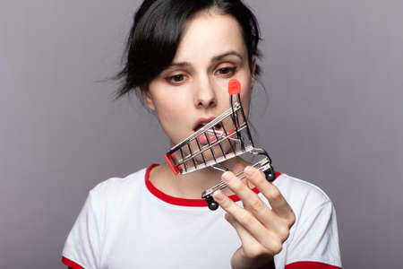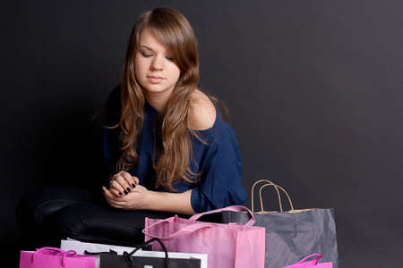 Beautiful young shopaholic woman with shopping addition. Black friday concept.