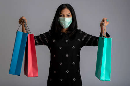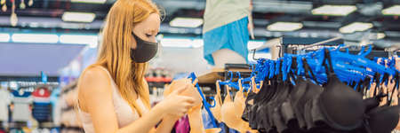 Woman in a clothing store in a medical mask because of a coronovirus. Quarantine is over, now you can go to the clothing store
