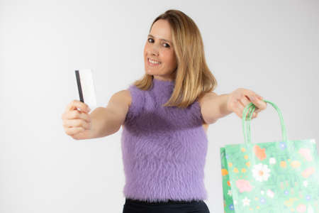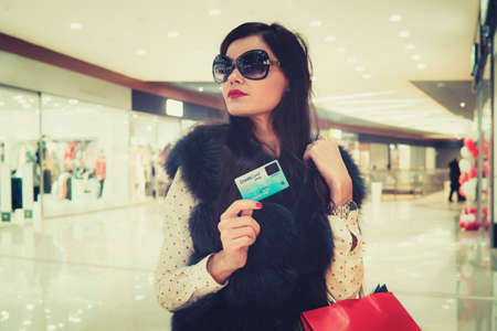 Close up of young beautiful woman with credit card and bag in hands at shopping mall background. Chic girl is doing shopping using payment card. Rich lady is going to buy something in luxury plaza