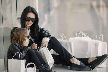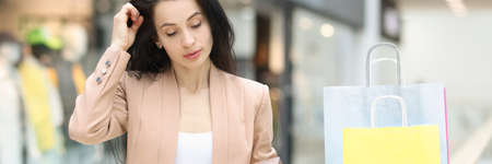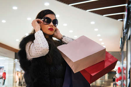 Half-shot of young attractive girl putting on sun glasses after shopping in shopping centre. Trendy brunette girl with paper bags walking in luxury store. Spending money in shops. Hunting for brands