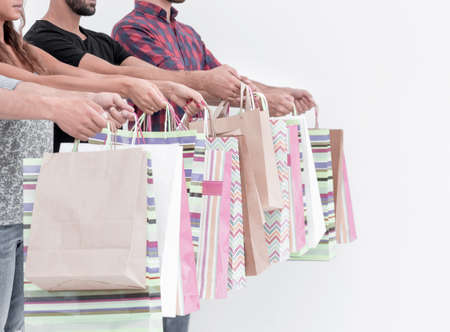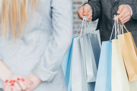 shopaholics and spending lifestyle. cropped shot of man and woman with multiple bags in hands.