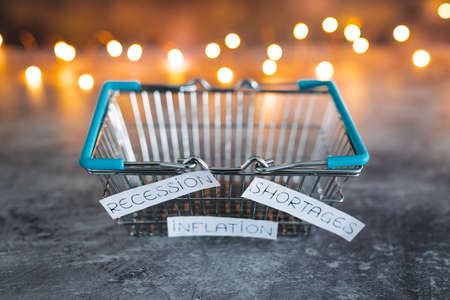 economy after conceptual image, inflation shortages and recession texts on empty shopping basket on dark background with lights